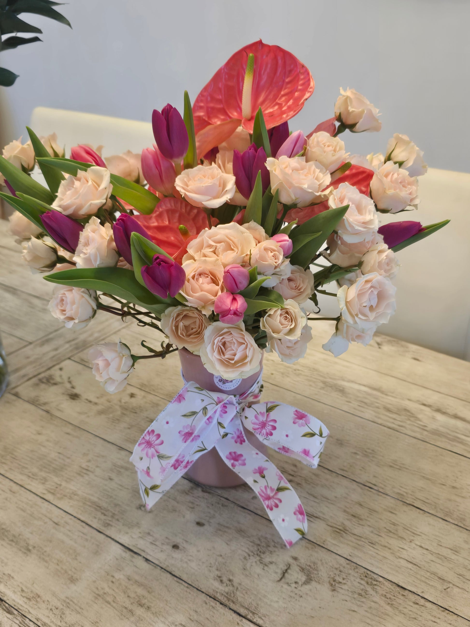 Spring is calling is a mixture of spray roses, 20 tulips and anthurium