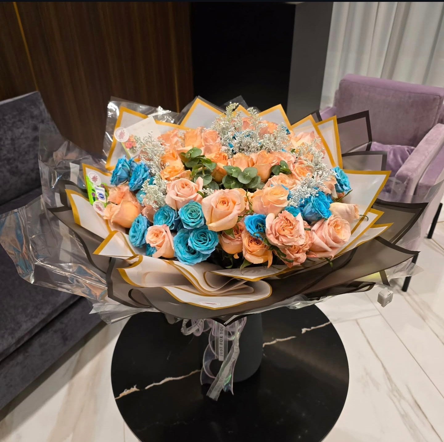 Comes with 60 roses, baby eucalyptus and some greenery, in a beautiful vase wrapped!